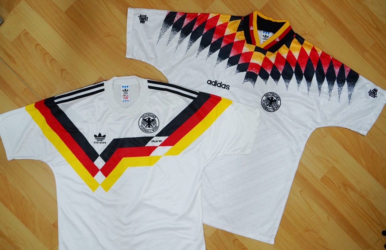 德國國家足球隊的球衣到目前為止(包括世界盃&歐洲國家盃),小弟個人覺得最好看的當屬1990世界盃和1994世界盃,雖然我從1998才開始看現場直播的世界盃,但是當每一屆的世界盃開打前一個月,都會有對於德國隊的賽前介紹、歷史紀錄,那鏡頭總會帶到這兩屆德國隊的精彩片段,不管是Lothar Matthäus舉起世界盃的瞬間,或是Jürgen Klinsmann的精彩入球,真是令人回味無窮阿..